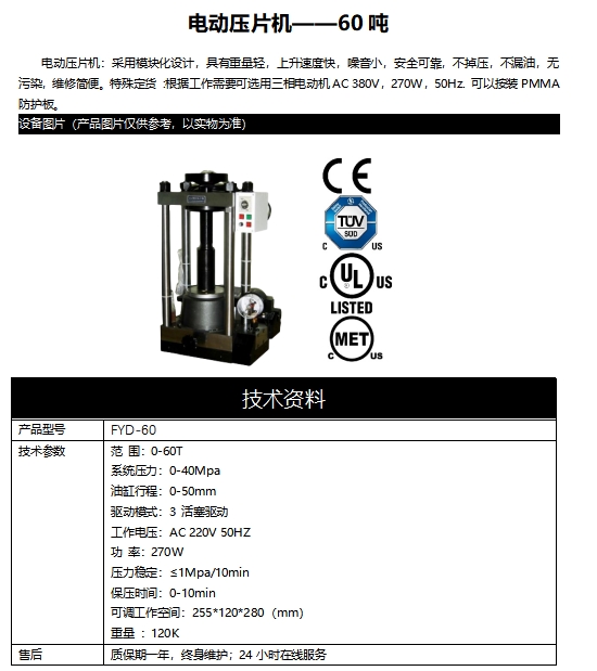 電動(dòng)壓片機(jī):采用模塊化設(shè)計(jì),具有重量輕,上升速度快,噪音小,安全可靠,不掉壓,不漏油,無污染,維修簡便。特殊定貨 :根據(jù)工作需要可選用三相電動(dòng)機(jī)AC 380V,270W,50Hz. 可以按裝PMMA防護(hù)板。